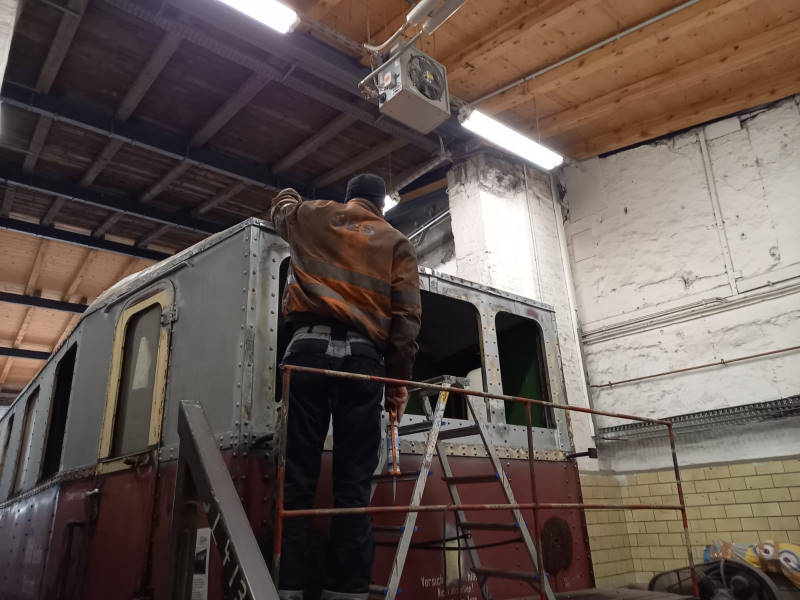 Wie schon vor kurzem berichtet, laufen nun die Arbeiten an dem Beiwagen 190 851 auf Hochtouren. Inzwischen konnten die Stellen, an denen der Rost die Außenhaut angegriffen hat, mit Rostumwandler behandelt werden. Dieser stoppt die weitere Oxydation des Metalls. Nachdem die chemische Reaktion abgeschlossen war, konnten weite Teile der Außenhaut des Wagens grundiert werden. Inzwischen sind die Seitenwände und das Dach gesäubert und mit Rostschutz versehen.