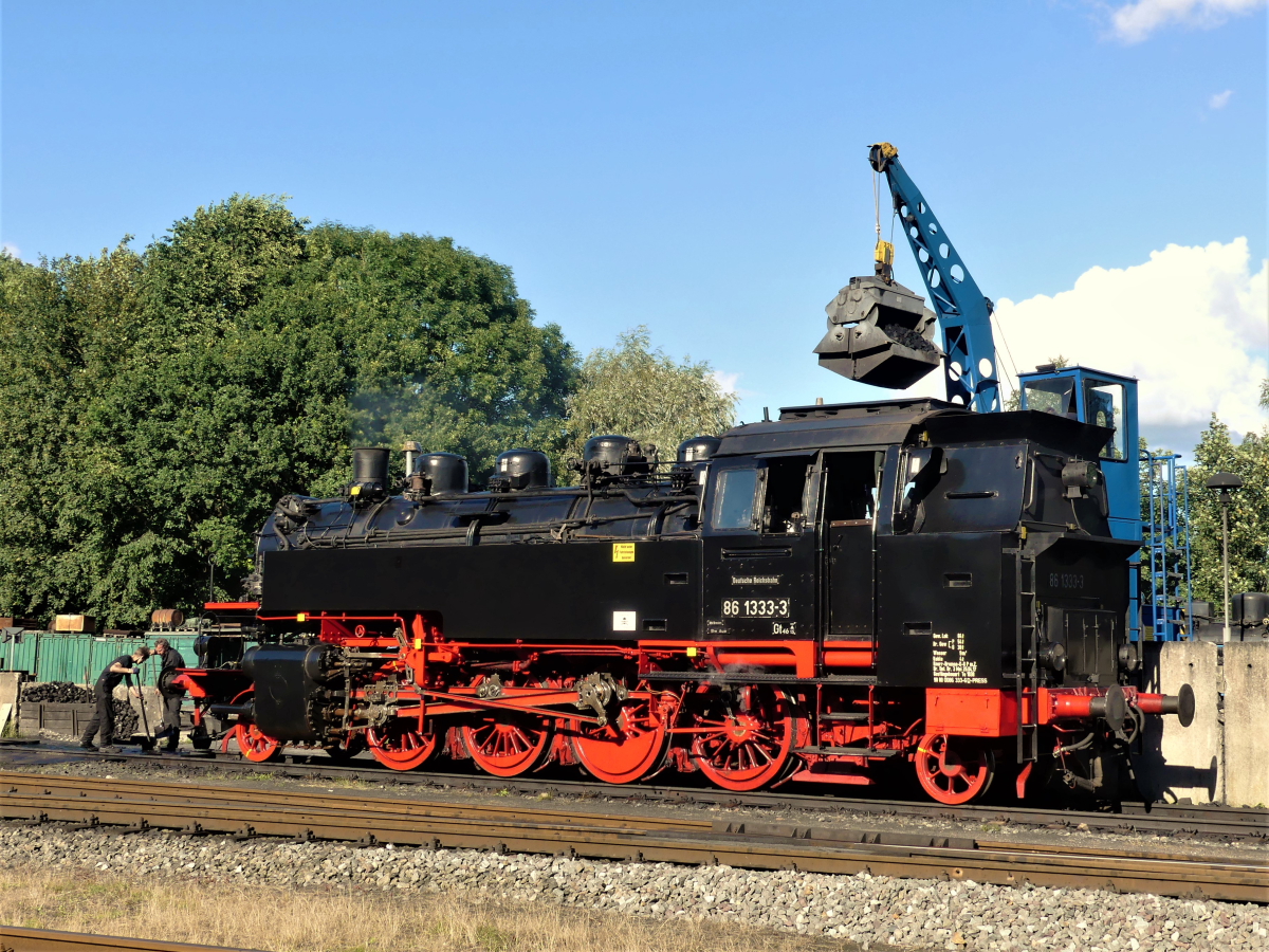 Mit Riesenschritten nähern wir uns unserer dritten und letzten Veranstaltung in diesem Jahr. Am 7. und 8.10. wird nach Möglichkeit nochmal alles dampfen und dieseln, was sich selbst bewegen kann. Eintrittskarten für die Veranstaltung gibt es vor Ort zum Preis von € 8,- (Erwachsene) / 4,- (Kinder) / 20,- (Familien). Dazu sind natürlich die etliche Vorbereitungen zu treffen, die uns schon seit einiger Zeit begleiten und immer intensiver werden, je näher wir dem Termin kommen. Was genau wird im Einsatz sein? Da wären zunächst einmal unsere beiden Dampfloks 50 3570 und Emma, die schon in den Startlöchern stehen. Unterstützt werden sie diesmal von der Dampflok 86 1333 der Pressnitztalbahn, die extra für unsere Veranstaltung ihre Heimreise von Hamburg bei uns unterbricht. Die Lokomotive wurde übrigens 1939 bei der Wiener Lokomotivfabrik Floridsdorf gebaut und wurde zunächst unweit von Wittenberge in Waren, Wittstock, Parchim und Güstrow eingesetzt. Quasi also ein Heimspiel.
